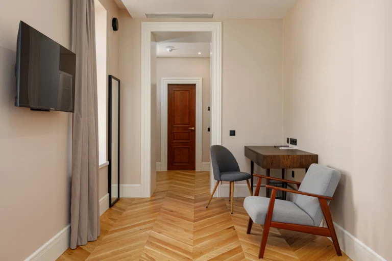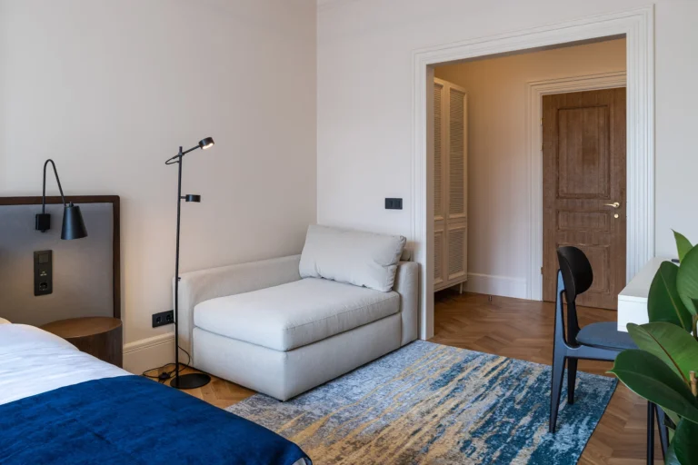 The view of the quiet courtyard perfectly complements our central location right on the Square. The suite consists of a bedroom with a large double bed and a seating area with a sofa, coffee table, and desk.