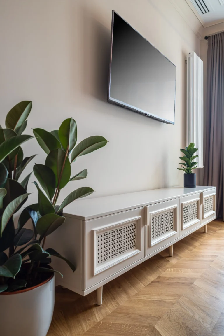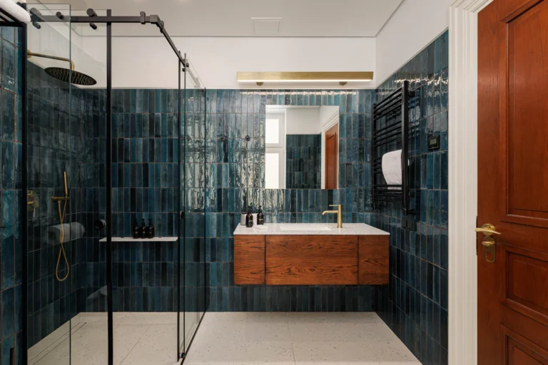 The room is equipped with all modern amenities, including air conditioning, a safe, a mini fridge, and a chic bathroom with a shower.