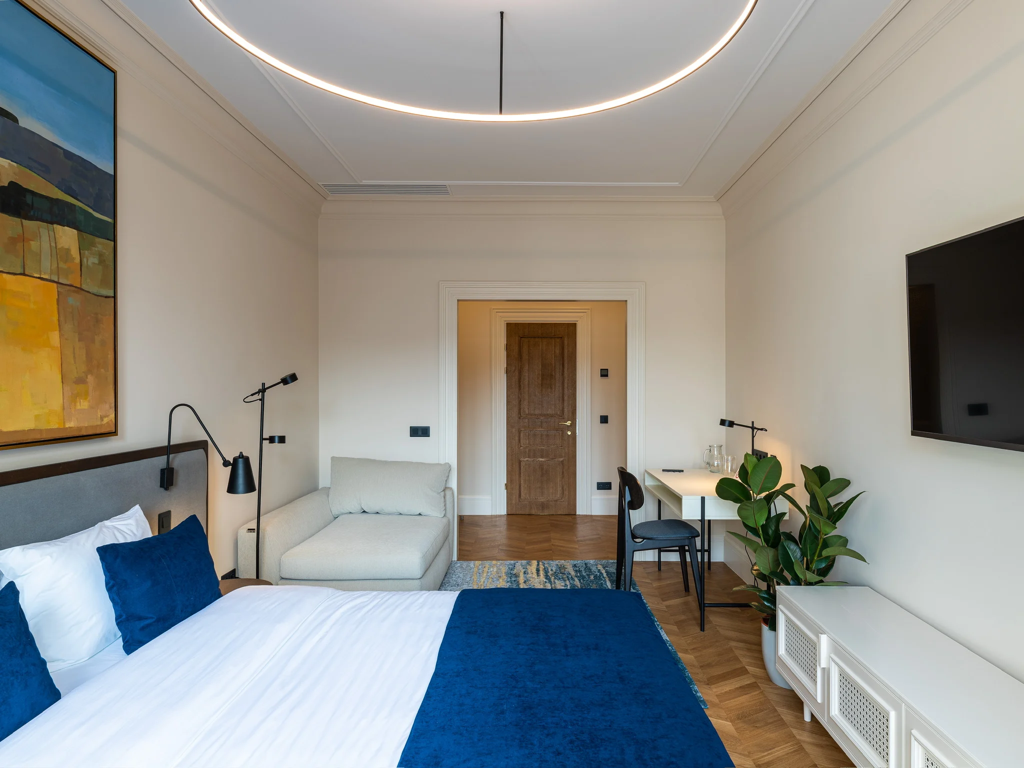The view of the quiet courtyard perfectly complements our central location right on the Square. The suite consists of a bedroom with a large double bed and a seating area with a sofa, coffee table, and desk.